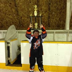 Many thanks to all the fans and supporters that came to the final midget hockey game at home last night. Kerrobert Minor Hockey donated the gate money of over $1000.00 and $1930.00 from the NHL Superstar goalie, Carey Price, Team Canada jersey raffle to Grayson Nunweiler`s family. Grayson took in all the activity in style, as the honorary captain of the Tigers with this win of the League Title! Can you spot him?
