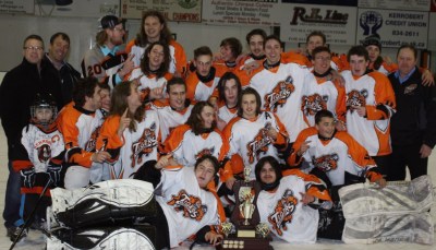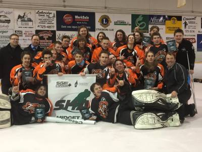 KDL Midget Tigers win the League title for the second season in fine fashion as they easily take out the second place Rosetown Redwings in the final home game of the season. One game remains in their Provincial playoff run with Strasbourg Maroons in their barn on Saturday night. Good luck!